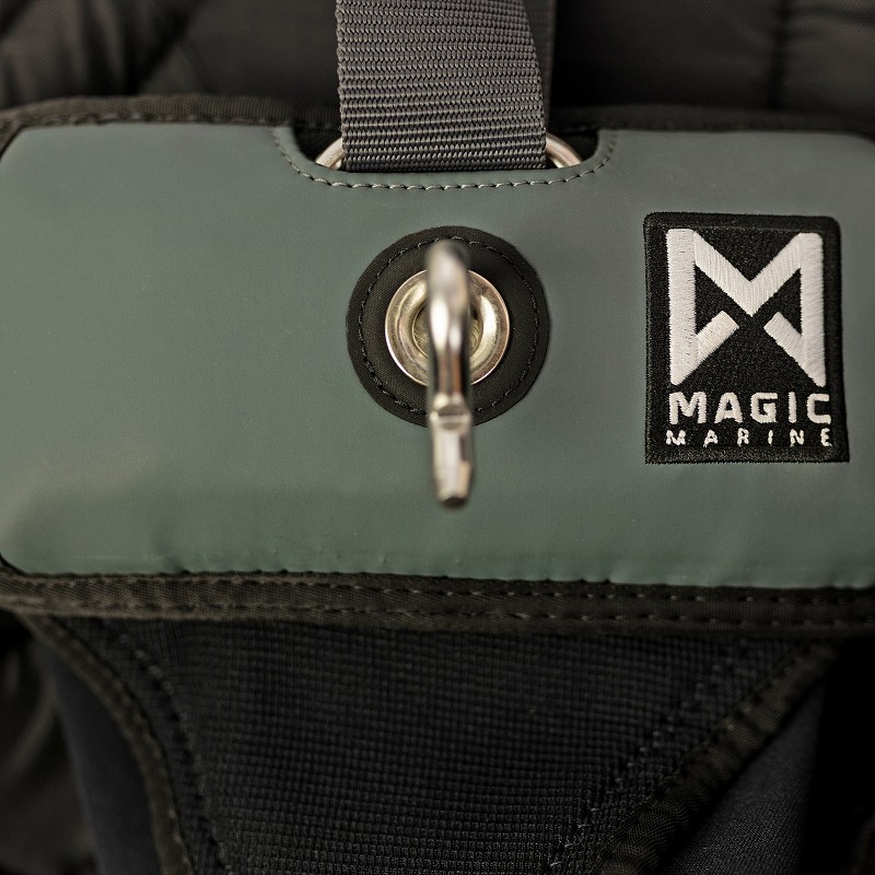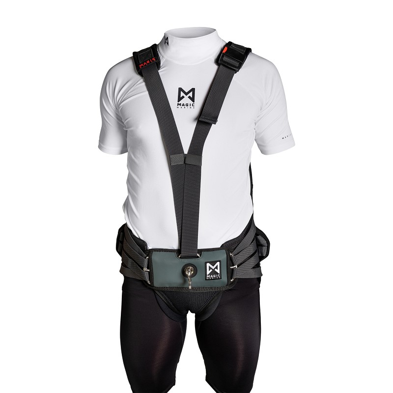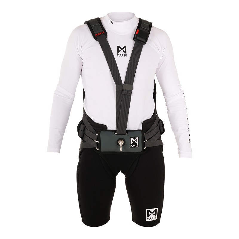 Designed in collaboration with Martine Soffiatti Grael and Kahena Kunze, 2016 & 2020 Olympic Gold Medalists and Magic Marine teamriders. This harness offers all round support in the most vital areas. A stiff foam panel in the back supports the two main muscles in your back, where a thinner panel at the spine allows for freedom of movement. The back panel is widened to give full support to the back with additional softer foam panels extending at each side of the back. There is NIA foam used in the hip panels to add further protection from impact whilst improving comfort at the hips. A wide spreader bar has been developed to spread the load around the body and improve posture. This can be adjusted with the 4-part adjustment system to ensure a good fit for every individual, where the adjustment allows the harness to be adjusted through the mid back and the butt parameters. All parts of the harness have been designed with the sailor in mind to promote longer durations on the wire, whilst limiting potential back and hip pain. Ideal for strong wind conditions.