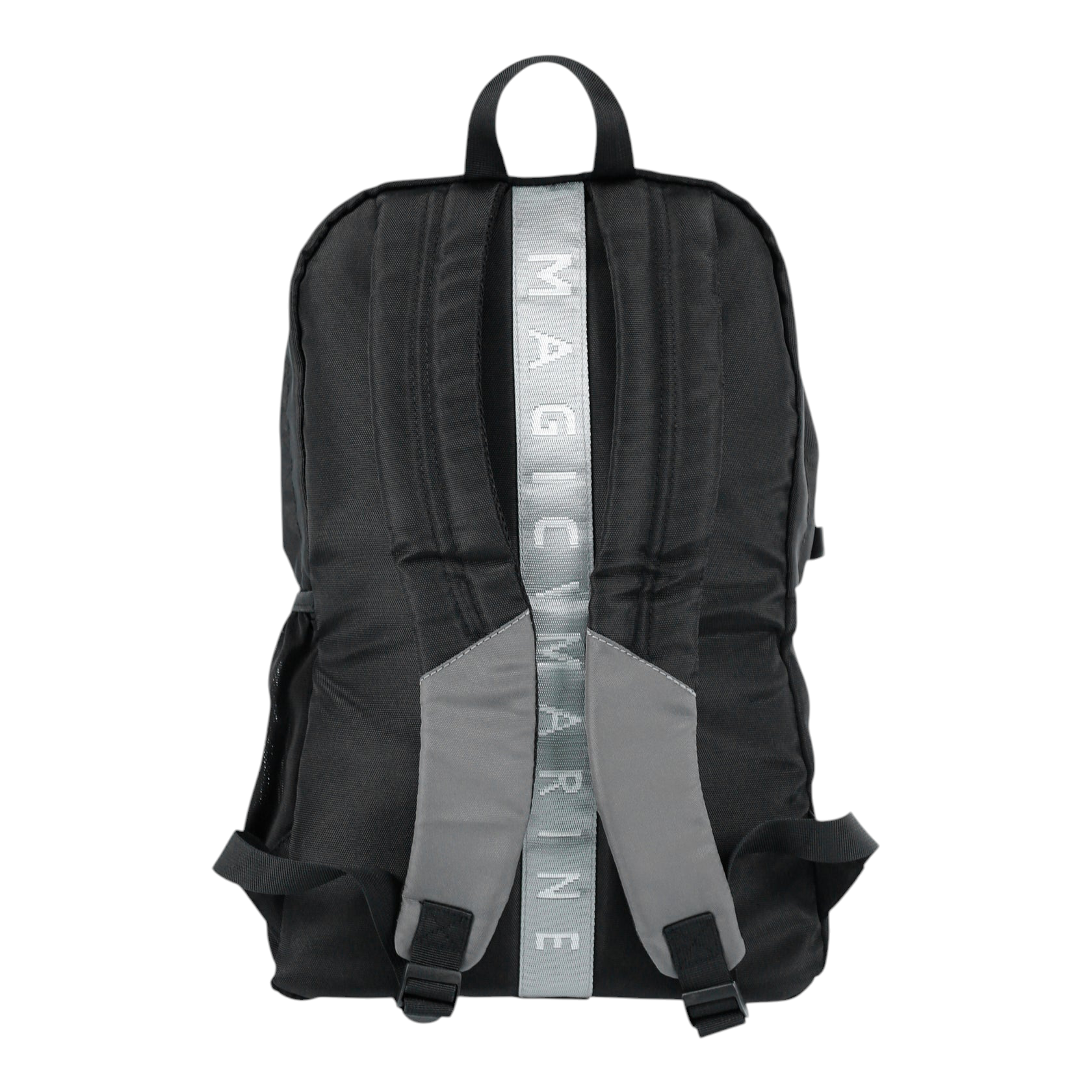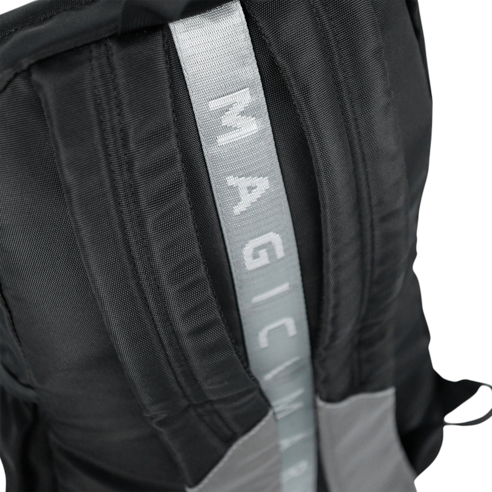 Mochila preta com alças acolchoadas e faixa cinza com texto 'MAGICIM'