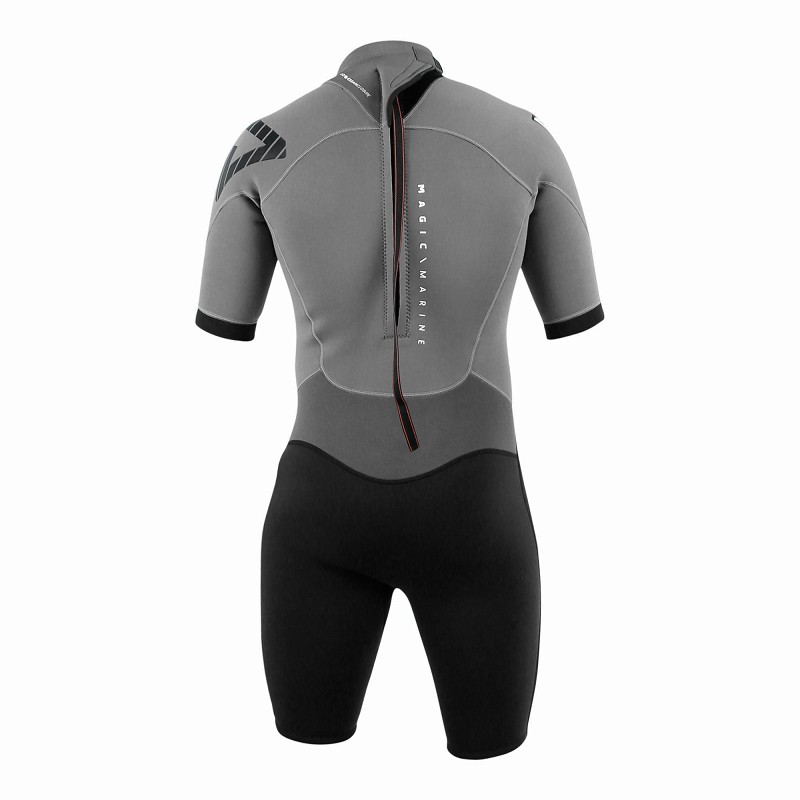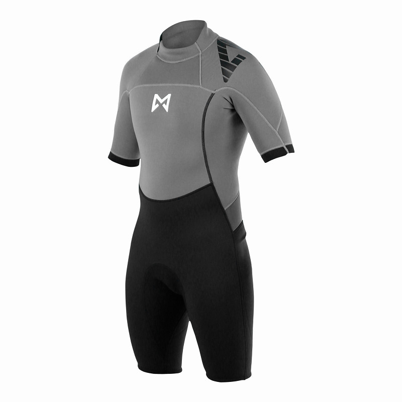 fato de surf curto em neopreno cinza e preto com logótipo M e texto MADE IN MASA