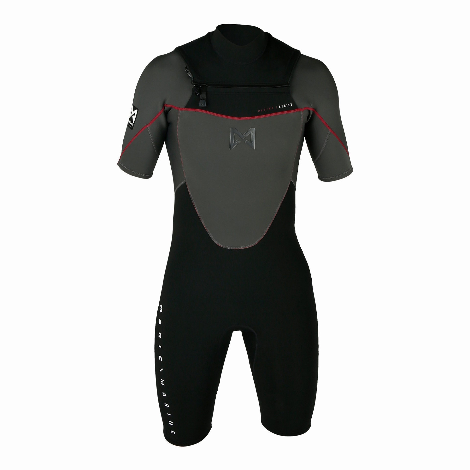 Fato de mergulho curto preto e cinza com costuras vermelhas