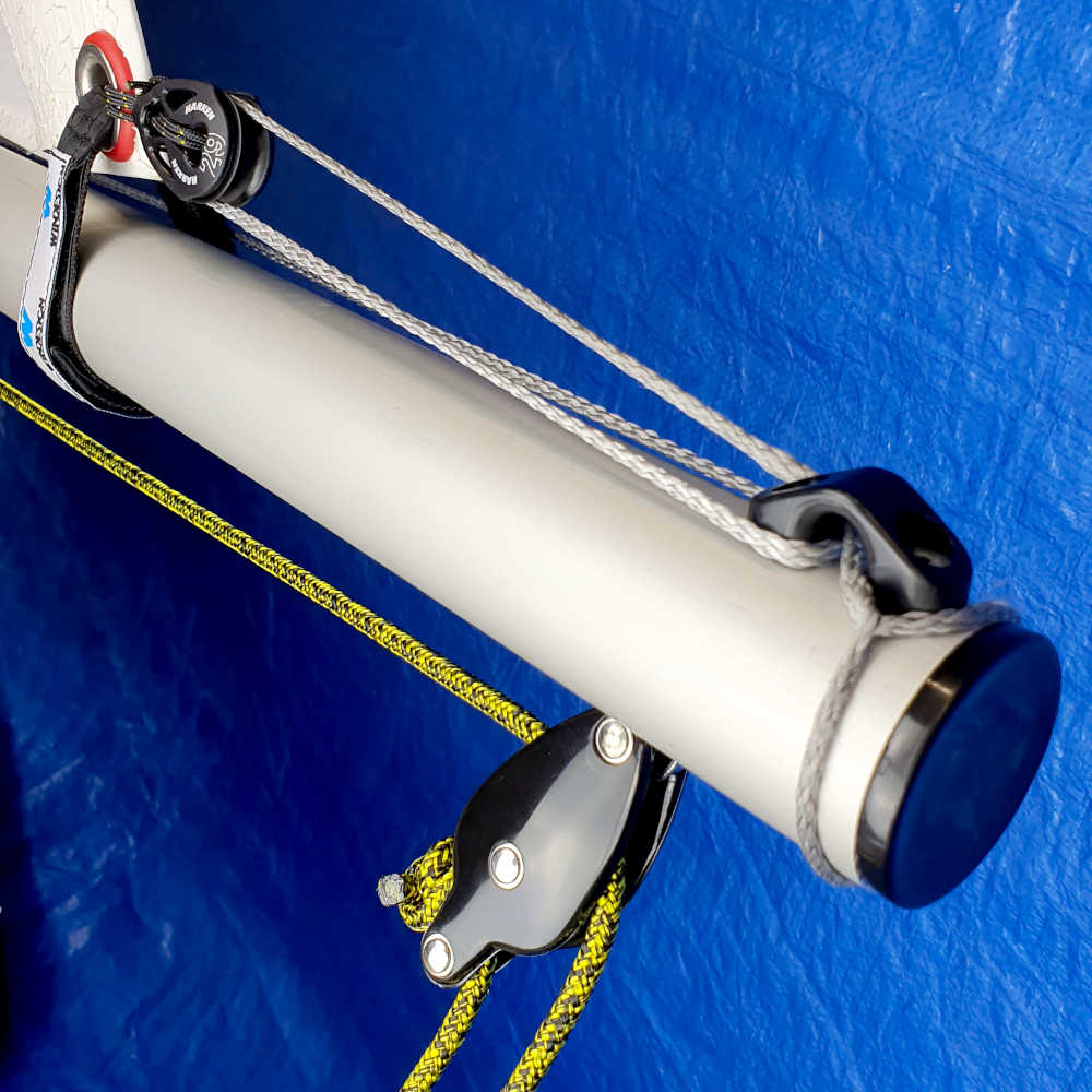 The outhaul comes with a 4 mm DB-Racing secondary control line, which has a Dyneema® core and a Technora/polyester cover for ultimate durability and excellent grip. The line is cut to the perfect length for direct use and can be further customized with either a loop handle or a braided handle.