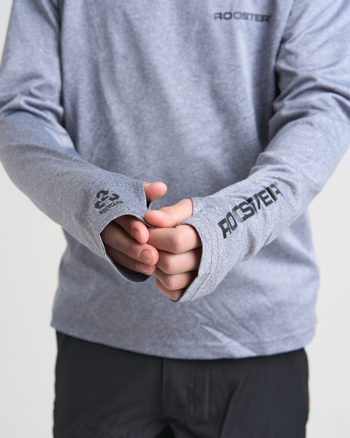 Camisola desportiva cinzenta com texto ROOSTER e símbolo de reciclagem nos punhos