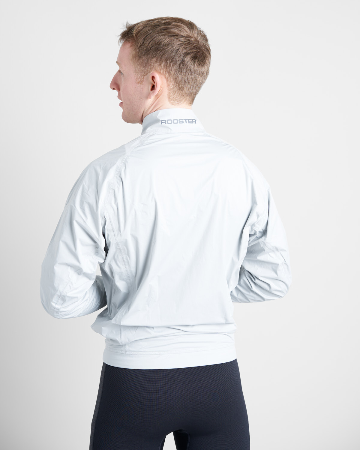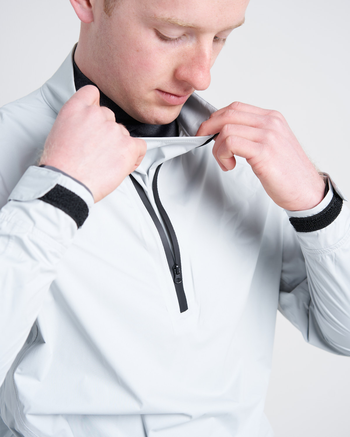 - Asymmetric long water-resistant zipper at neck with gusset behind – great for ventilation