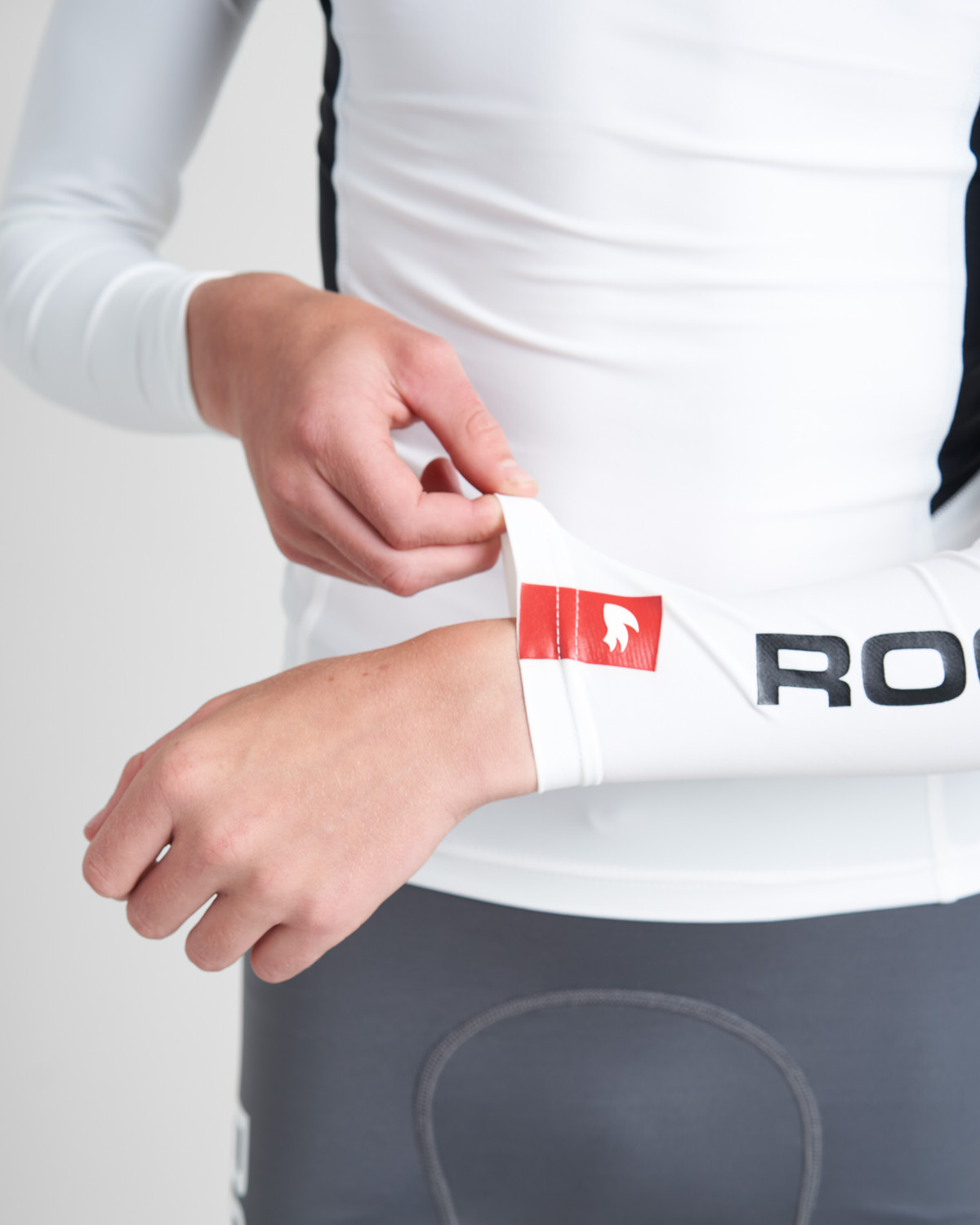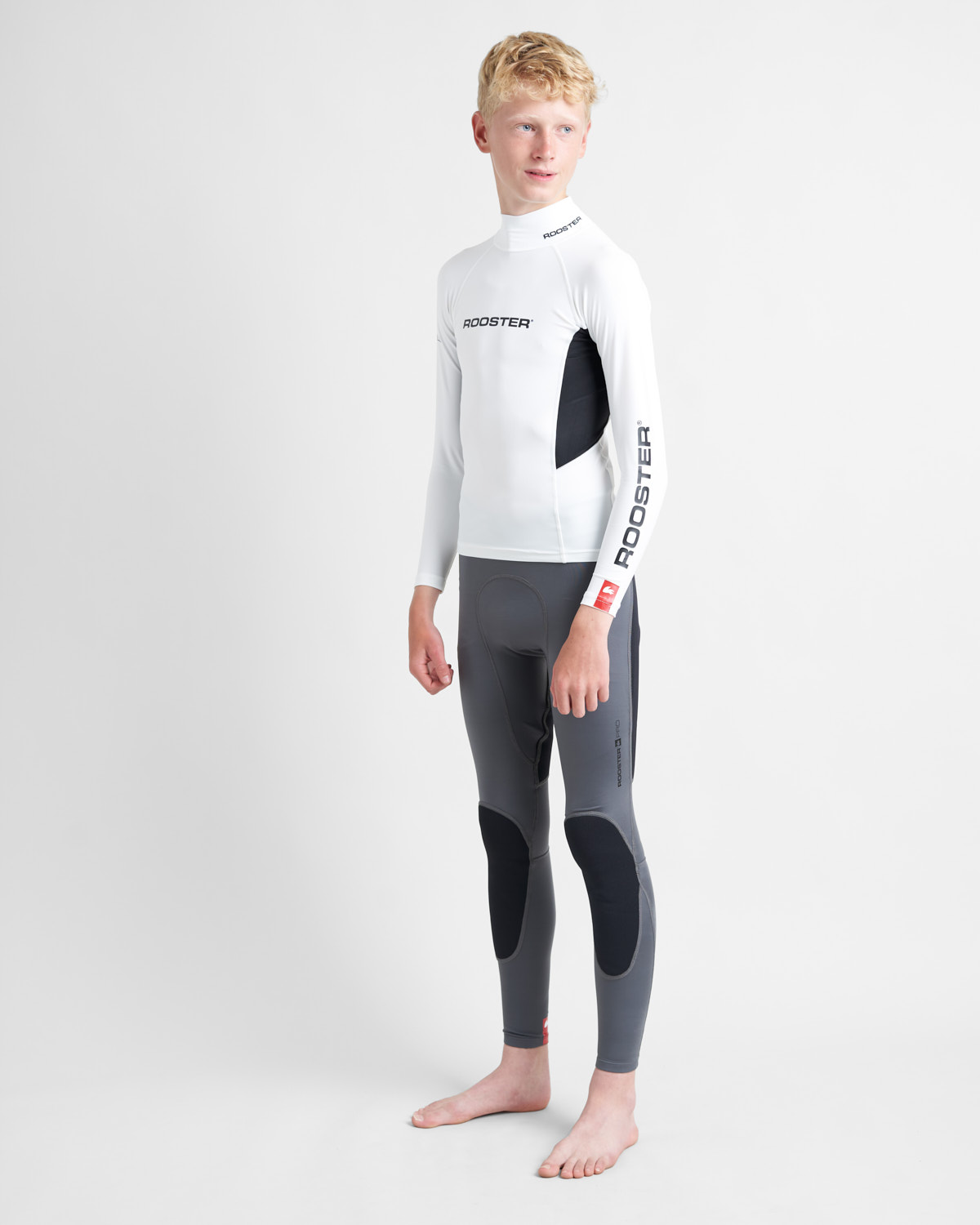 Rapaz com roupa desportiva branca e cinzenta com logótipo ROOSTER
