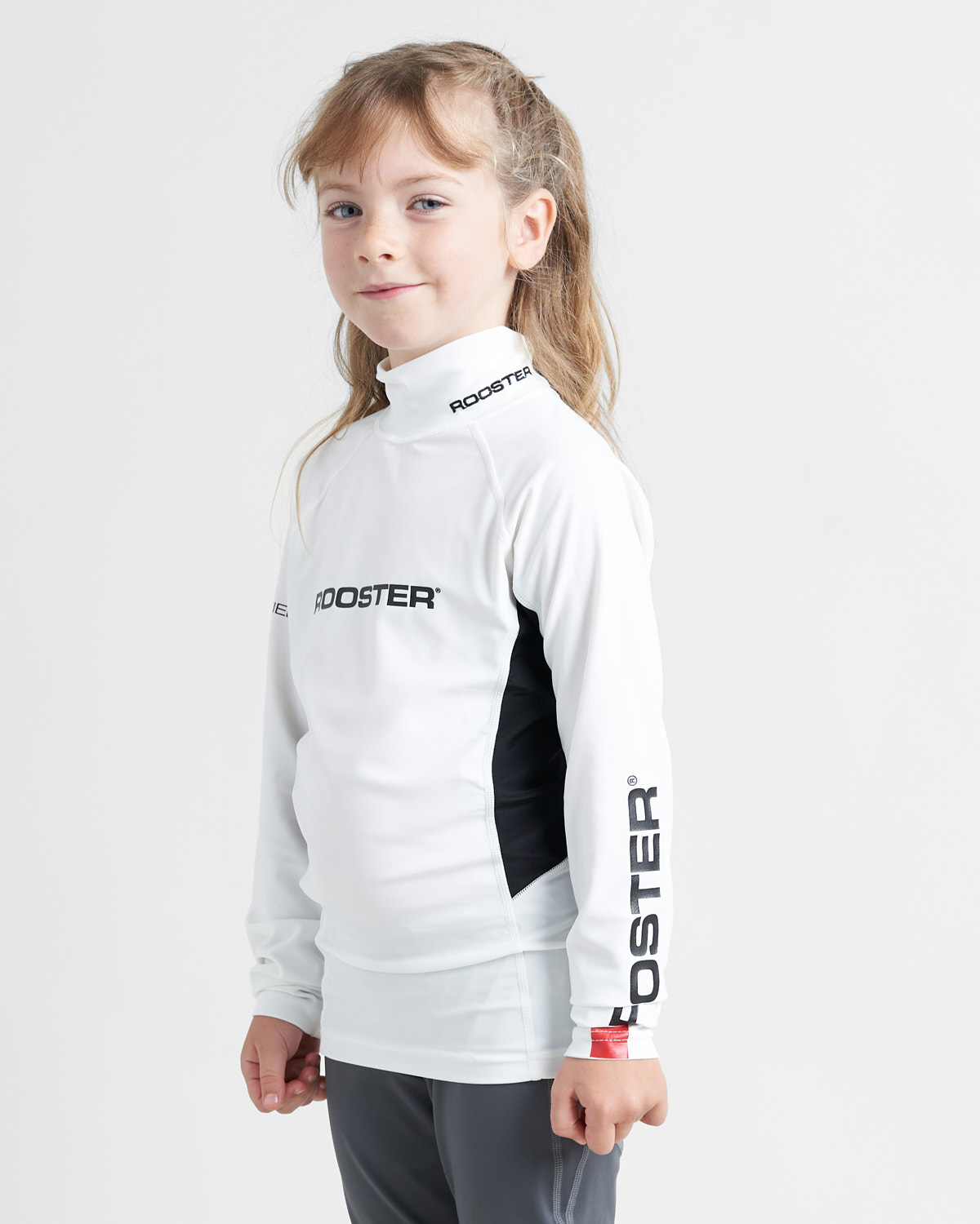 Camisola térmica branca com logo ROOSTER usada por criança