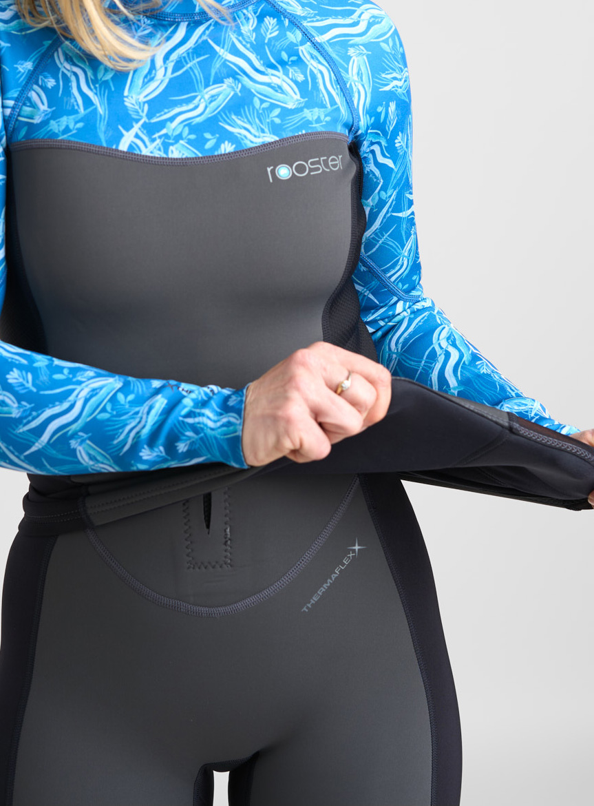 Our latest innovation for 2024: the revamped Thermaflex® 1.5mm Neoprene Top, tailored specifically for women. Crafted with an ultra-soft, stretchy design, this garment builds upon the success of our Azure version. We've meticulously integrated feedback from customers, female focus groups, and advancements in materials and technology to elevate every aspect of this piece.