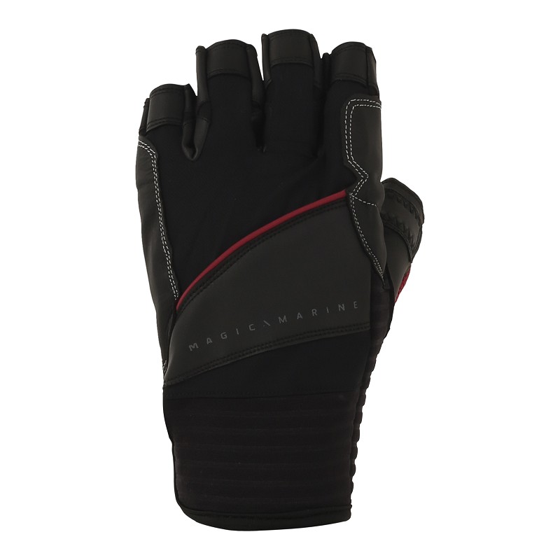 Luva preta meio dedo com linhas vermelhas e texto Magic Marine
