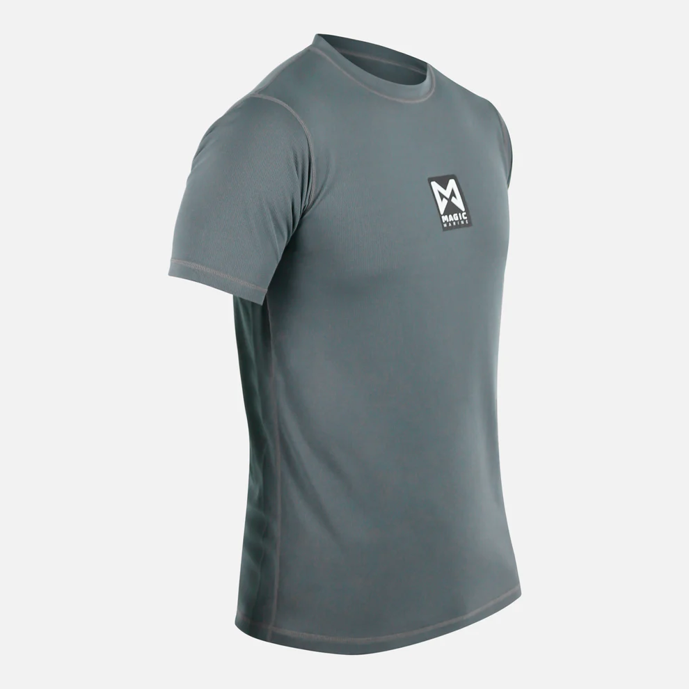 Camiseta cinza escuro com logo Magic Magnet e texto UV50+